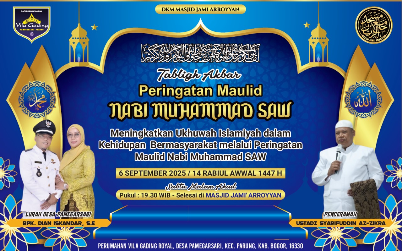 Bogor, 6 September 2025 / 14 Rabiul Awwal 1447 H – Alhamdulillah, Masjid Jami’ Arroyyan yang berlokasi di Perumahan Vila Gading Royal, Desa Pamegarsari, Kecamatan Parung, Kabupaten Bogor, kembali menggelar Tablig Akbar Maulid Nabi Muhammad SAW. Kegiatan tahunan ini berlangsung dengan penuh khidmat sekaligus meriah pada Sabtu malam Ahad, dimulai ba’da Magrib hingga selesai.